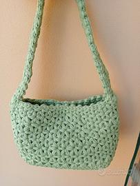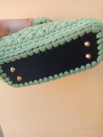 vendo borsa in fettuccia lavorata a mano all uncinetto (colore verde pistacchio). misura 17cm in altezza e 26cm in lunghezza fondo rigido nero.