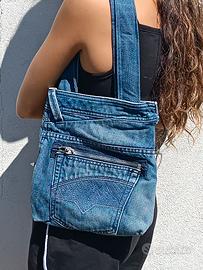 Borsa in jeans riciclato fatta a mano, foderata, decorazioni di gattino sul davanti e fiocchi. Tasca posteriore, con cerniera, e sul davanti.