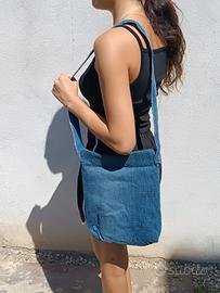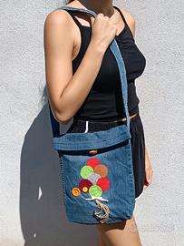 Borsa in jeans riciclato fatta a mano con decorazione a forma di palloncini sul davanti e chiusura a bottone.