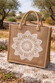 Elegante borsa in juta naturale impreziosita da centrino antico salentino originale lavorato all’uncinetto, realizzato interamente a mano secondo la tradizione artigianale del Sud Italia.