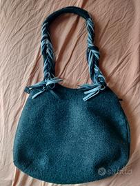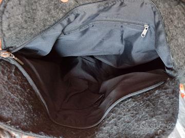 Borsa in lana cotta grigia con due manici intrecciati, foderata all'interno con una tasca con zip