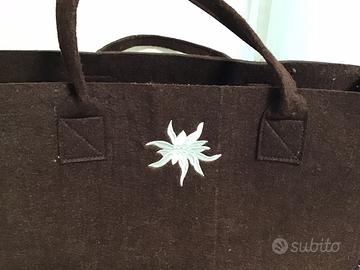 Borsa in lana cotta marrone con ricamo stella alpina. Data la misura utilizzabile per usi diversi, tipo portariviste o altro. Adatta per la casa di montagna