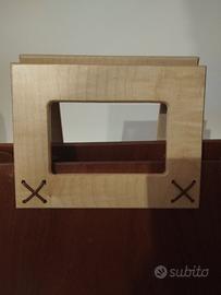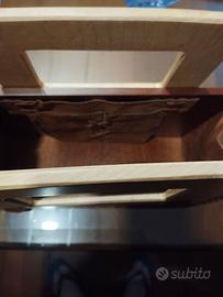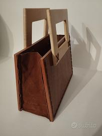 Vendo borsa in legno pregiato di iroko con manici in frassino, interno in pelle, tasca con cerniera, articolo realizzato artigianalmente, pezzo unico. Oggetto molto particolare. Prezzo richiesto euro 180.