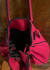 Borsa Leghilà modello Franzy, bicolore in rosso vermiglio e nero, in neoprene taglio a vivo e frange, cm 40x30. Lavabile in lavatrice a 30°, non si graffia, non si stropiccia e non perde la sua forma originale. Prezzo in negozio più di 200€