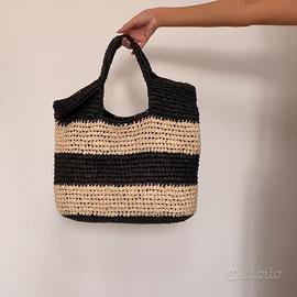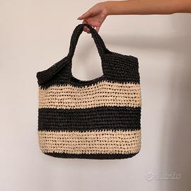 Bellissima borsa tote, modello bauletto in paglia, fantasia a righe fasce orizzontali nere e bianca. Borsa a spalla vintage in paglia
