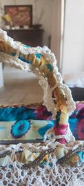 Borsa in paglia, mai usata, molto bella, lavorazione artigianale, con dettaglio a uncinetto e corallini colore ambra sui manici e sul davanti.
