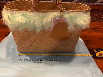 Bellissima borsa in paglia Le Chicche di Emanuela Biffoli con piume intorno al bordo superiore. Mai usata con etichetta e dust bag originale.