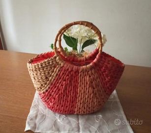Vendo Borsa in paglia con manici in osso - ciuffi di paglia con foglia verde davanti - foderata con chiusura a lacci. Condizioni buone.