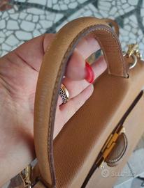 Dettagli: metalleria dorata, manico rigido e tracolla regolabile