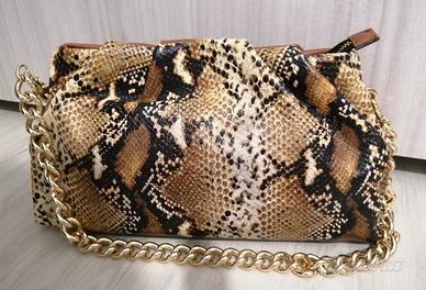Borsa in pelle, fornita di doppia catena, chiusura a cerniera. Un lato pelle tinta unita, l'altro pelle effetto rettile. Mai utilizzata.