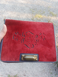 Bella borsa a tracolla blu e rossa Cesare Piccini Firenze, in pelle e velluto; splendido il motivo sul velluto rosso davanti. Catena dorata per la tracolla, interno in pelle con marchio in prossimità del taschino interno. Chiusura a scatto con bottone, sotto un'imponente guarnizione in ottone. Originale anni '70.le misure:17 centimetri altezza, 25 centimetri lunghezza, 8 centimetri spessore. Senza custodia originale