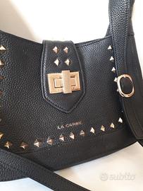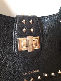 Borsa in pelle marca La Carrie. Vedere in internet i prezzi di queste borse. La borsa è in ottime/ buone condizioni. Il colore è nero con inserti il colore dorato. il colore oro della chiusura è leggermente scolorito . vedi foto.