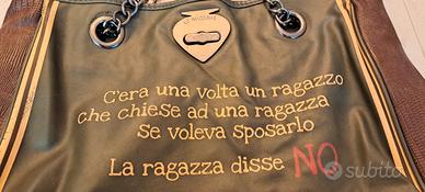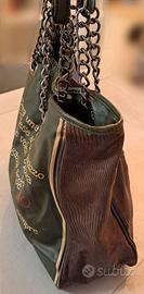 Borsa originale Le Pandorine in pelle colore verde e marrone. usata pochissimo; chiusura a girello a forma di picca capovolta, inserti in catena tra i due manici; all’interno fodera con logo e tre scomparti di cui uno con cerniera. Molto capiente. Misure larghezza cm. 40 - lunghezza 34 - profondità 15.