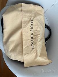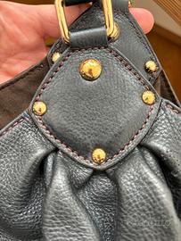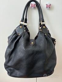Pelle nera morbida, tinta unita con monogram logo impunturato. Bordi del fondo leggermente usurati. Interno in alcantara con qualche segno.