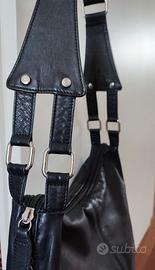 Bellissima borsa a tracolla originale Mandarina Duck in vera pelle nera . Chiusura con zip, 2 tasche esterne laterali chiuse con zip (una delle quali contiene un pratico portachiavi), una tasca interna con zip e 2 scomparti interni a tasca. Logo presente su ogni borchia e dettaglio. Misure 30 x 28 cm, profondità 10 cm. Bella e pratica.