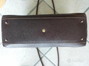 Lunghi manici per una comoda tenuta sulla spalla. Interno foderato con 5 tasche di cui tre con cerniera e chiusura del tutto con clip magnetica. Misure L 40, P 12, H 29 (60 con manici). Piedini in metallo sulla base per appoggio.