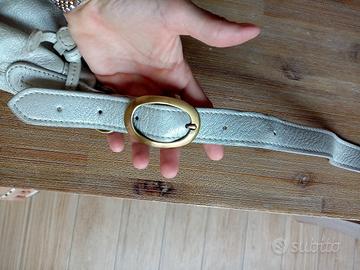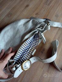 Borsa a tracolla in pelle Mazzini. Colore argento. Tracolla regolabile. 2 tasche esterne e una interna. In perfette condizioni all'esterno. All'interno la fodera è macchiata vicino alla cerniera, perché quando l'ho lavata ha lasciato il colore del metallo. ( Vedere ultima foto). Per il resto è in ottime condizioni. In vera pelle.