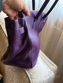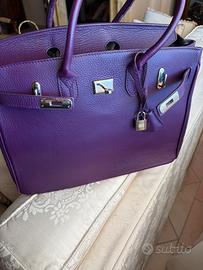 Borsa in pelle di bellissimo colore viola scuro. Copia esatta della Birkin, prodotta da artigiani italiani, NO LOGO. Esterno: pelle dollaro Interno: Pigskin -pelle di maiale Interno standard: una tasca cernierata e due tasche laterali, in più ha una taschina in pelle e porta penne. Hardware: argento Dimensioni: 38x26x16 In ottimo stato