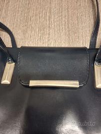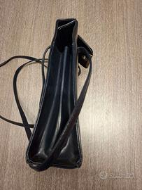 Piccola borsa rigida, dalla forma compatta e geometrica. Presenta una patta frontale lineare con inserto metallico rettangolare color oro chiaro, ripreso anche nei dettagli degli attacchi del manico. È dotata di tracolla sottile per portarla a spalla o a bandoliera, con interni organizzati in più scomparti grazie ai soffietti laterali. Linee essenziali, senza loghi visibili, aspetto sobrio e pulito.
