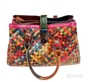 Borsa in pelle multicolore con design intrecciato. Due manici e tracolla.