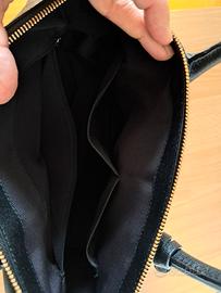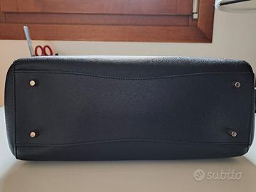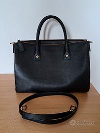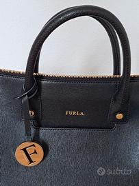 Borsa in vera pelle nera marca FURLA, di forma trapezoidale, indossabile a mano e a spalla, misure 30 cm x 22 cm x 13,5 cm ( quest'ultima nel punto più largo del fondo) con tracolla removibile lunga 70 cm, zip, ganci, scritte, piedini sul fondo e particolari in metallo color oro, fodera interna in tessuto rigato nero con n.3 tasche di misure diverse e sacca custodia in tessuto.