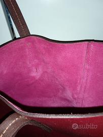Borsa in pelle ,tipo shopping bag, (perché non ha la lampo) in pelle rosso/bordeaux all' esterno e camoscio rosa shocking all' interno,nuova ,mai usata,dimensioni cm.40x36x14,fatta a mano,marca Donatella Lucchi Milano.