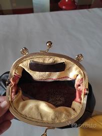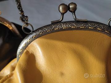 la borsa color moro presenta la struttura dorata, mentre quella color ocra presenta la struttura bronzo. L'interno è foderata con tessuto damascato . manifattura artigianale