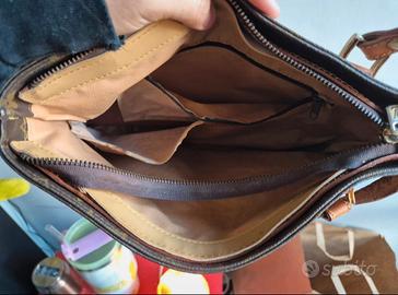 Borsa in pelle con manici che presentano alcune imperfezioni e piccole scuciture interne (visibili in foto). La pelle esterna è in ottime condizioni morbida e ben conservata - ideale da far sistemare da un artigiano o da riutilizzare per creare un borsello più piccolo.