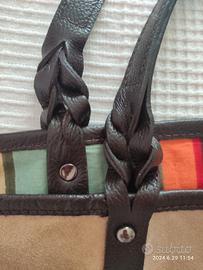 color nocciola e inserti color caffè, capiente,interni di fodera coloratissima,completa di pochette sganciabile,rifiniture,fondo e manico perfetti.mai indossata.