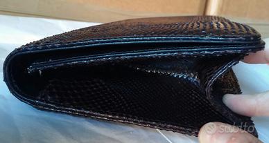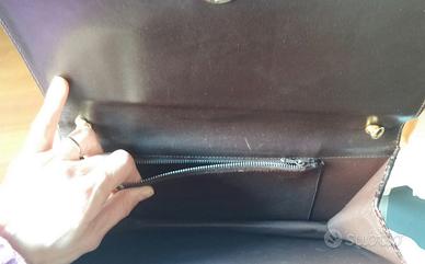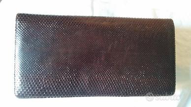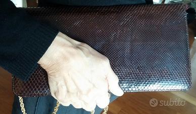 Vendo bellissima borsa in pelle di lucertola, vintage degli anni 60-70, in ottime condizioni sia esternamente che interiormente, colore marrone testa di moro, con chiusura con bottone automatico, tasca interna, foderata in pelle, soffietto per aumentarne la capienza e pratica tracolla in catena dorata rimovibile, da portare sia a spalla che come pochette a mano. Mis:lungh.29xalt.16x prof.4 cm. Prezzo eu 59 leggermente trattabile. Per vederla scrivete all'indirizzo mail indicato.