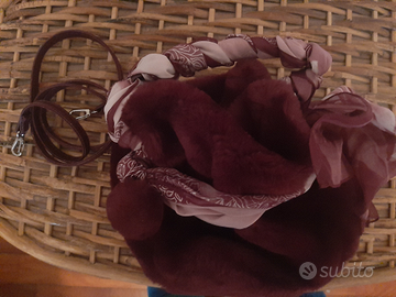 Borsa in pelliccia di colore bordeaux, impreziosita da pon pon in pelliccia e foulard coordinato. Da portare a mano o con comoda tracolla abbinata. Dimensioni 20x20.