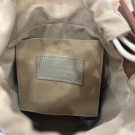 Realizzata artigianalmente in Italia, questa elegante borsa a secchiello unisce la raffinatezza della vera pelle di vitello alla leggerezza della rafia naturale. Il design rigido e compatto è valorizzato da dettagli in metallo color oro e una lavorazione curata nei minimi particolari.