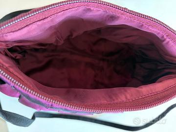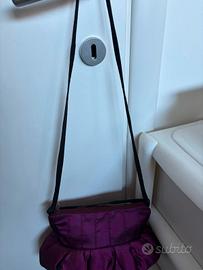 borsa in seta colore porpora con tracolla regolabile, fodera interna e chiusura con zip.