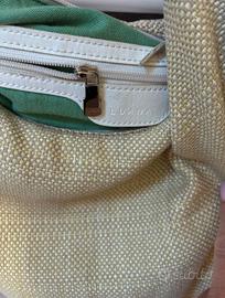 Borsa in tessuto beige marca Luana con bordatura e manico in pelle bianca. foderata con fodera verde, con tre tasche interne di cui una con cerniera.