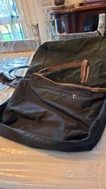 Misure Altezza 33 larghezza 30 profondità 13 Questa borsa è una capiente borsa a mano o a spalla, caratterizzata da un colore verde oliva e una texture in vera pelle scamosciata e i manici/tracolla in contrasto. Il design morbido e la forma capiente la rendono simile a una borsa "hobo" o a una "shopper".