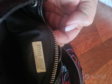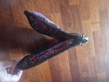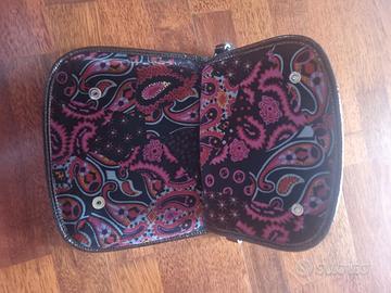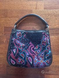 Splendida borsa nera con manico rigido, in velluto con motivi in cachemire dai colori fucsia, celeste, gallo ocra, rosso e viola, con doppio scomparto unito da un bottone a pressione. Manici rigidi in pelle impunturata. Interno foderato con tasca a chiusura zip. Bordata in rifinitura di pelle a contrasto. 27 scomparto posteriore, larghezza cm.25 anteriore, altezza cm.27.