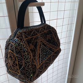Borsa in velluto nero con ricami oro a contrasto, con cerniera di chiusura e taschino interno