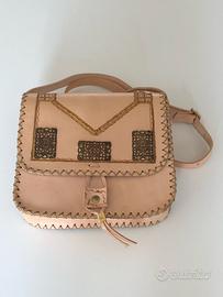 Borsa color cipria con inserti in metallo stile etnico. Vera pelle, sia dentro che fuori, dotata di tracolla non removibile, che si può riporre all’interno della borsa. Inclusa la fodera esterna (originale). Prodotto artigianale, fatto a mano.