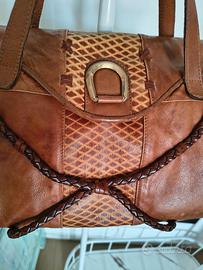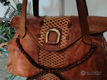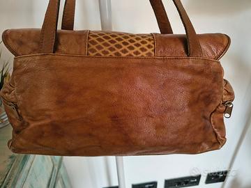 Borsa in vera pelle color cuoio, morbida, con manici e chiusura a ribalta. Due scomparti interni più tasca interna con cerniera. Misure cm. 40x27 circa.