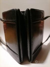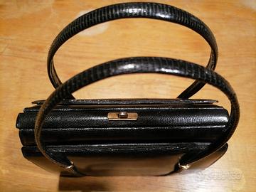 Borsetta in pelle di lucertola anni 60. Misure 21,5X16. 3 scomparti, quello centrale presenta 2 tasche di cui una con cerniera. Chiusura in metallo dorato. Perfette condizioni.