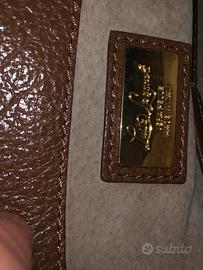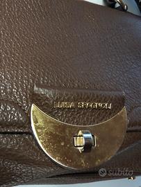 Borsa in vera pelle Luisa Spagnoli. Misura larghezza 32 cm, altezza 22 cm, profondita’ 13 cm. E’ una borsa a mano, a cui e’ stata aggiunta una tracolla, removibile, in tessuto spesso a fantasia. Presenta segni di usura lievi sugli angoli, che comunque non compromettono la qualita’ e l’estetica della borsa, una vera icona di eleganza e praticita’.