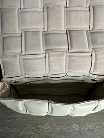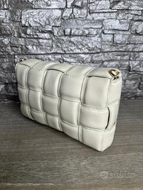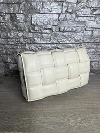 Borsa artigianale realizzata in vera pelle e 100% Made in Italy chiusura con bottone a pressione nascosto color oro tracolla in pelle regolabile staccabile pochette interna staccabile pelle intrecciata tasca interna con zip accessori in metallo color oro dimensioni 27x18x8 (cm) colore borsa: Beige