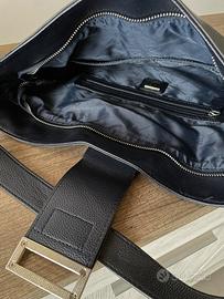Elegante borsa in morbida pelle, blu notte con dettagli dorati. Pratica e capiente, con zip interna, taschini laterali esterni chiusi con zip per oggetti da avere a portata di mano, tasca interna. Nessun difetto. Tenuta benissimo.