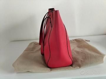 Borsa rossa in vera pelle, a due manici. Misure della base cm 30x13, altezza cm 29. Con custodia originale. Manici leggermente usurati.