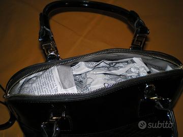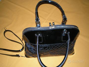 Borsa in vernice trapuntata sotto i manici con taschino e 2 tasche interne e chiusura a doppia cerniera. Completa di tracolla.