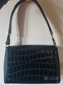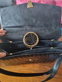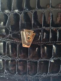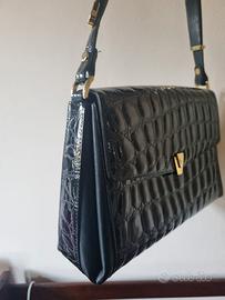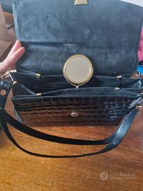 Borsa nera rigida, in vero coccodrillo, anni 60, con doppia tracolla a spalla. Marca: storica pelletteria artigianale Renè. In perfette condizioni mai usata. Misure L 30 H 21. P10 Interno in pelle con triplo scomparto con annesso suo specchietto rifinito in coccodrillo sul retro.