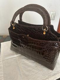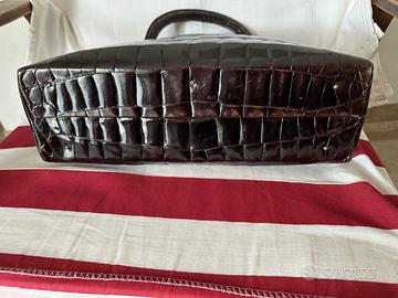 🐊 Borsa in Coccodrillo marrone con 2 manici, dimensioni 33 x 24 x 11 e due aperture esterne. All’interno ci sono due tasche con cerniera e due tasche a bustina. Non sono presenti imperfezioni sugli angoli e sulle maniglie.