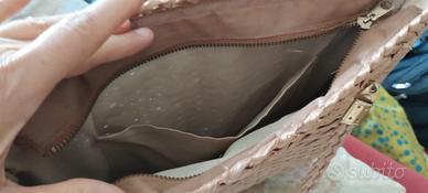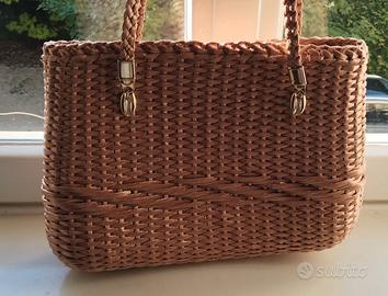 Borsa in rafia intrecciata con chiusura e fissaggio in ottone. Scomparto unico con interni in stoffa in condizioni perfette Dimensioni 40 x 27cm