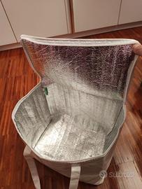 Vendo borsa termica da trasporto, dimensioni 30x20x30 cm, con interno argentato isolante per mantenere la temperatura di alimenti e bevande.