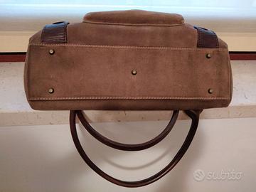 Borsa in pelle scamosciata cappuccino, dettagli in pelle color cioccolato e